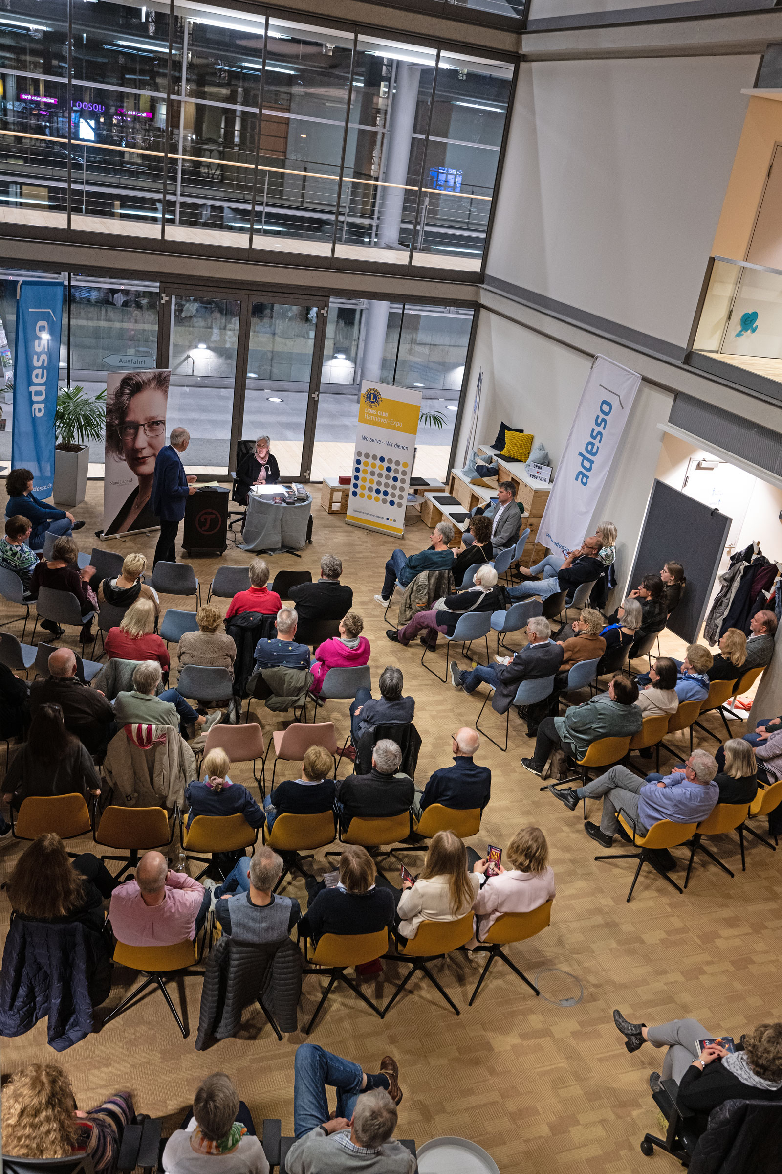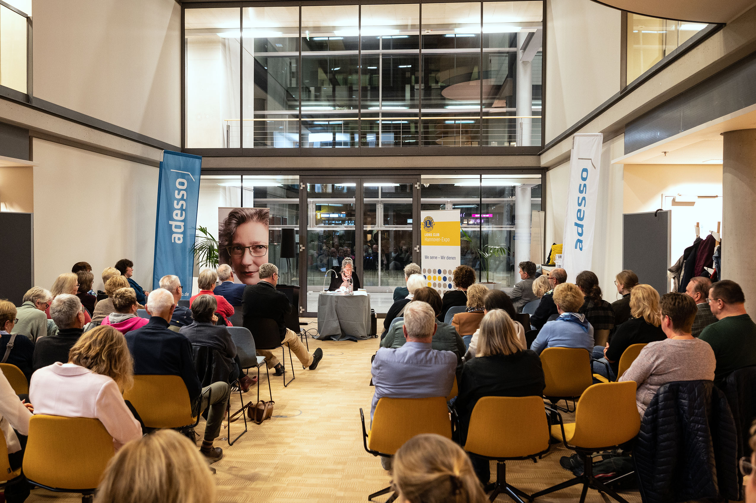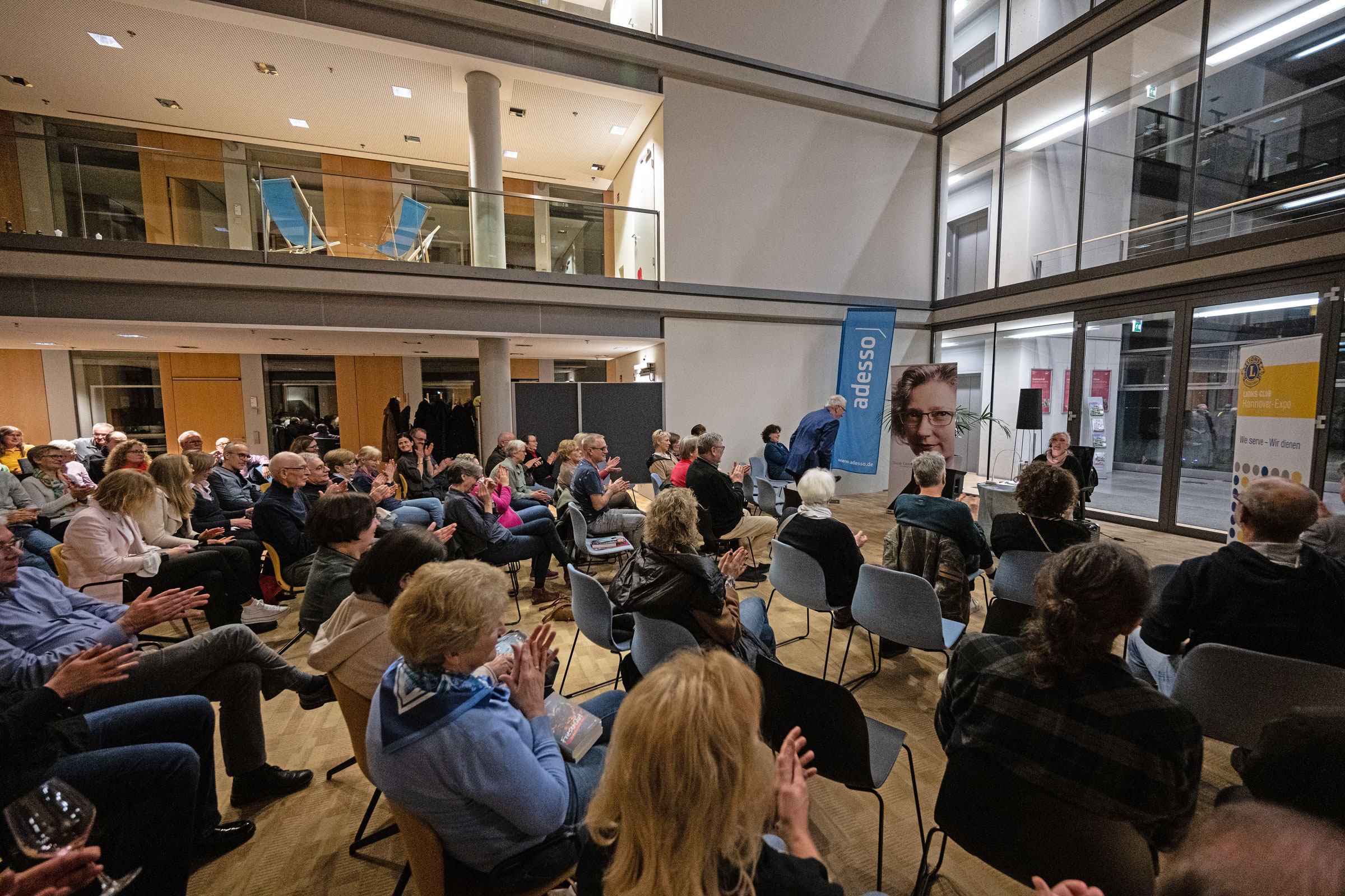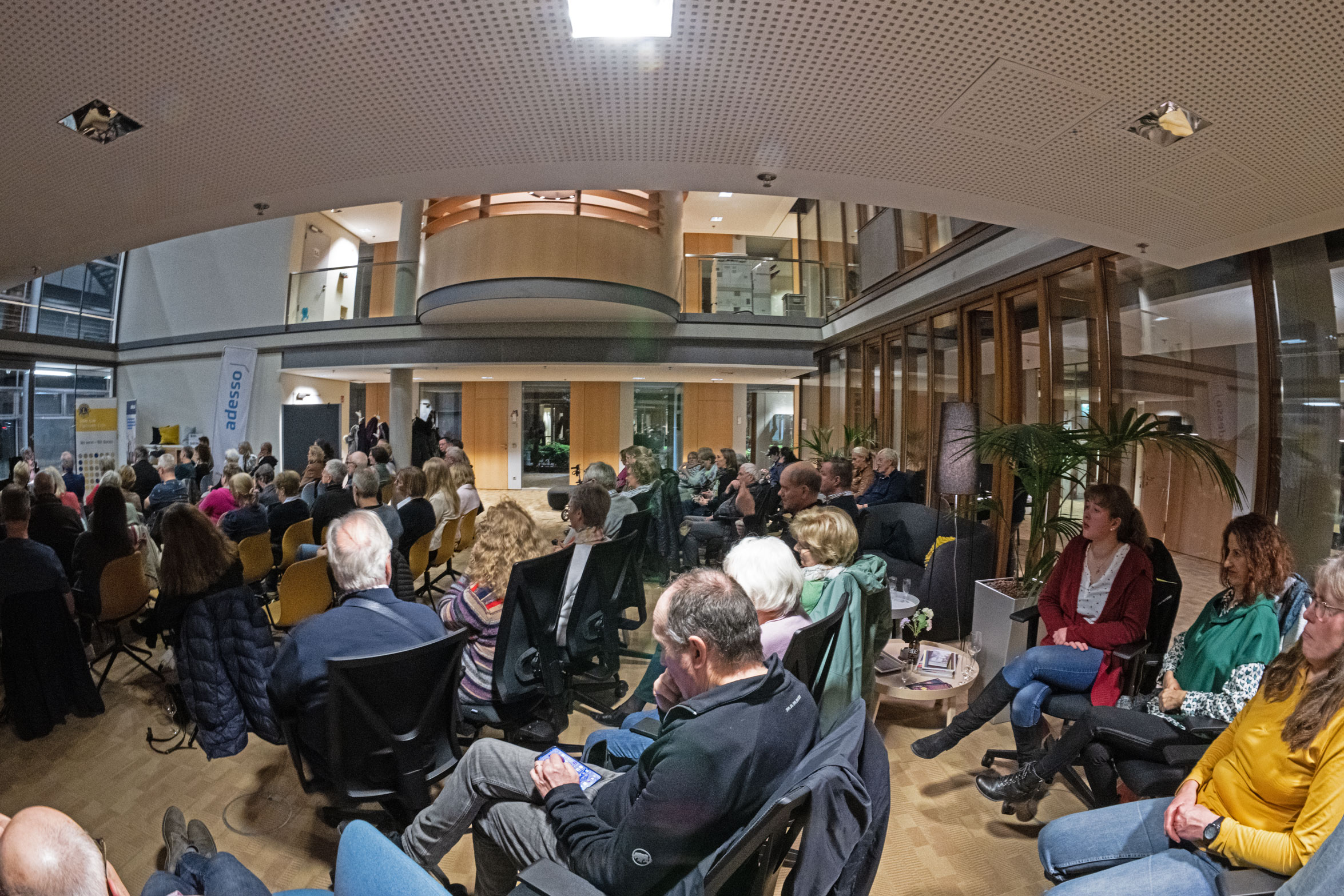 Jochen Stiepel, Kompetenzcenterleiter beim Gastgeber ADESSO SE an der Kugelfangtrifft in Hannover-Bemerode, hatte die Gäste zu Beginn der Lesung begrüßt und den erfolgreichen IT-Dienstleister vorgestellt. Zur Überraschung und zum Wohlbefinden der Gäste trugen auch die Besonderheiten des Gebäudes bei. Wer hatte schon mit einem Abendimbiss im Grün eines riesigen Wintergartens gerechnet!