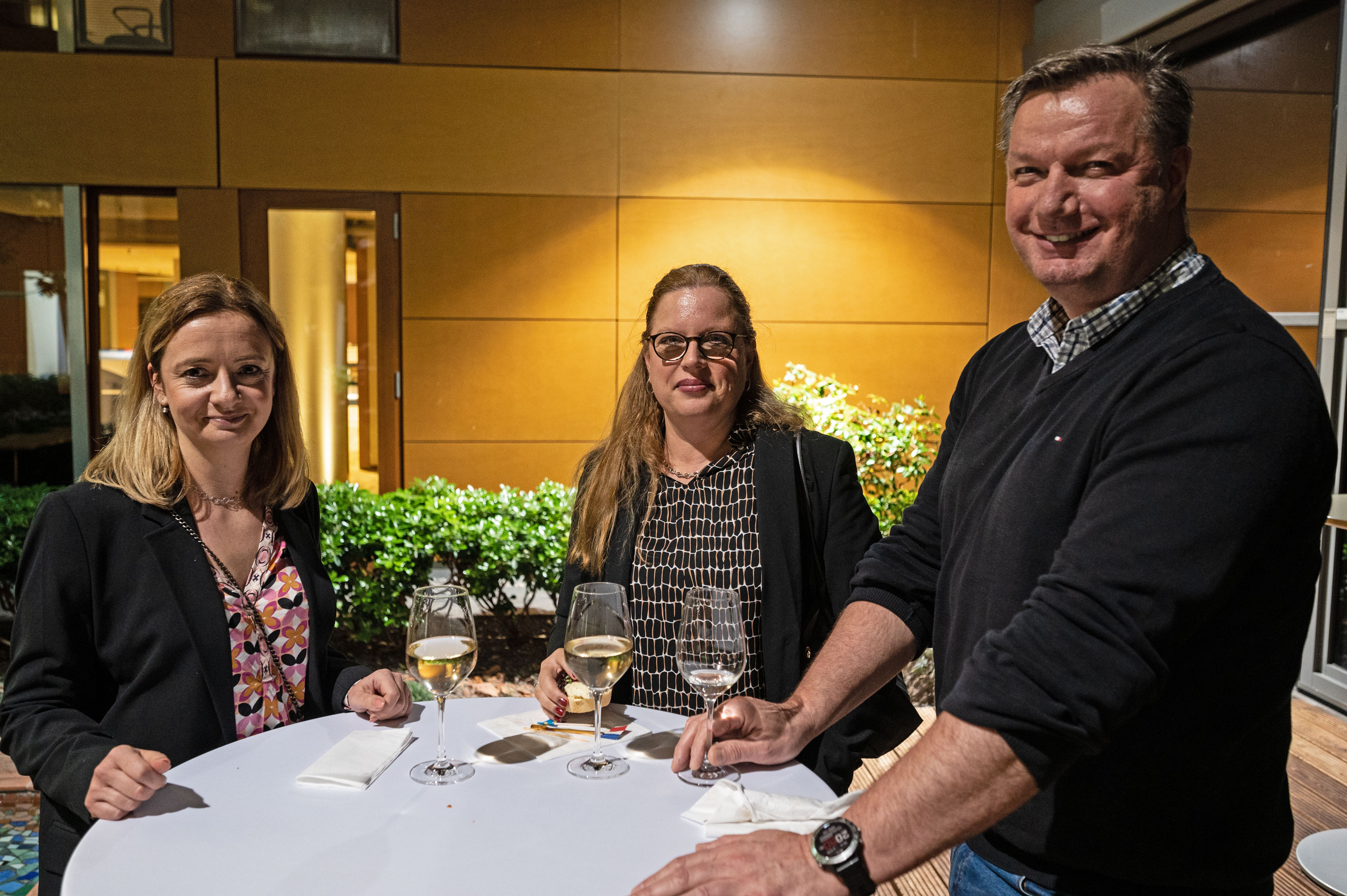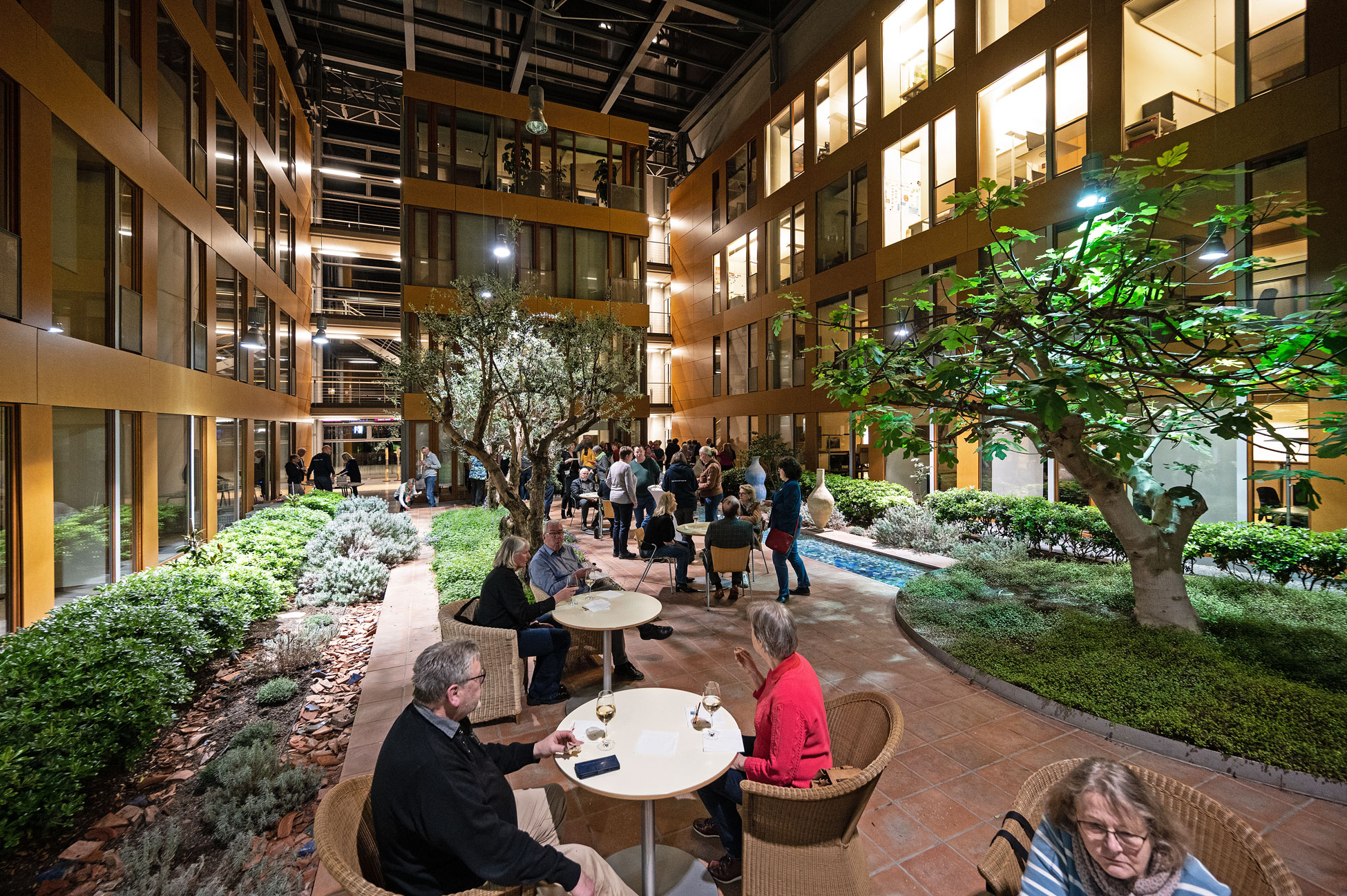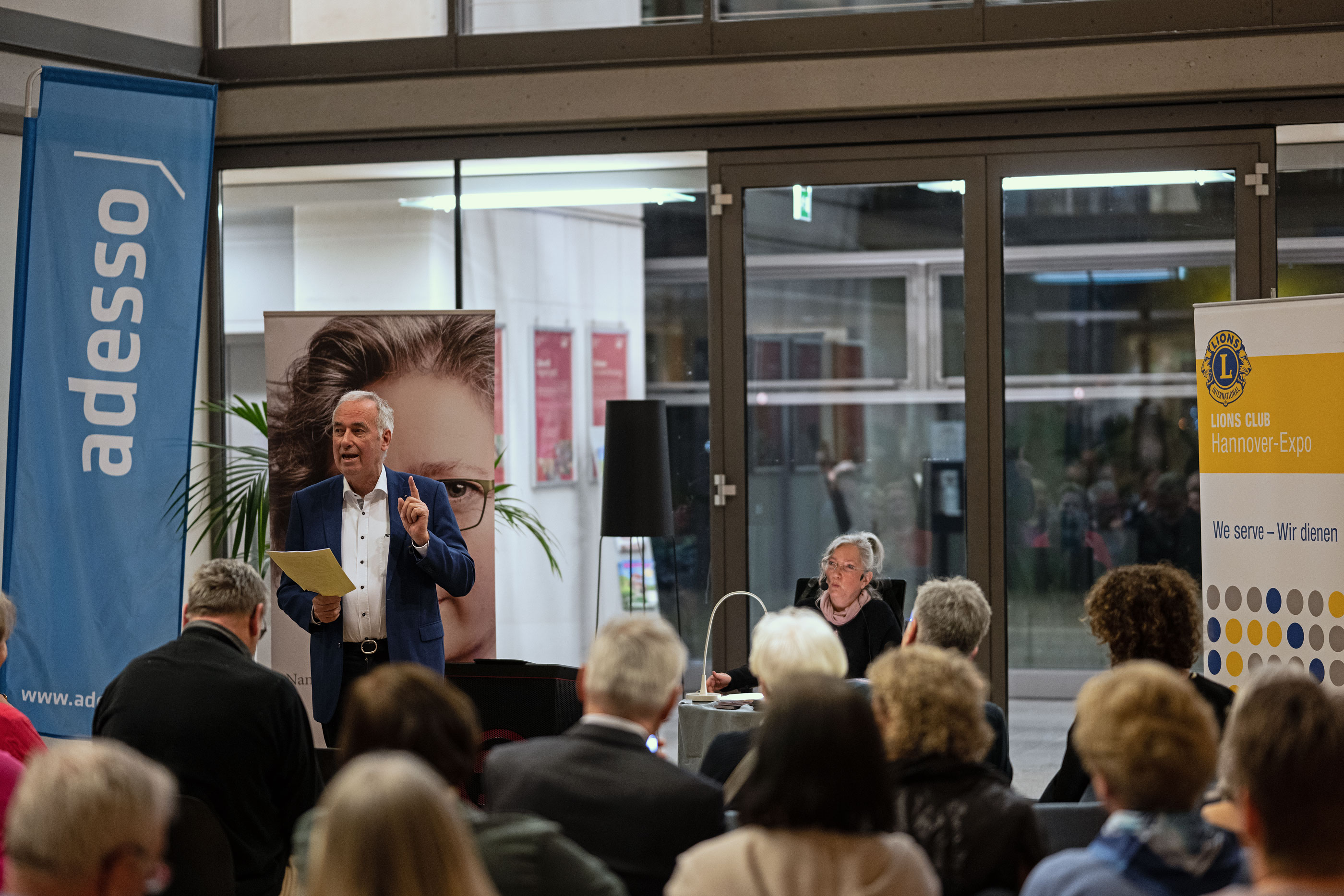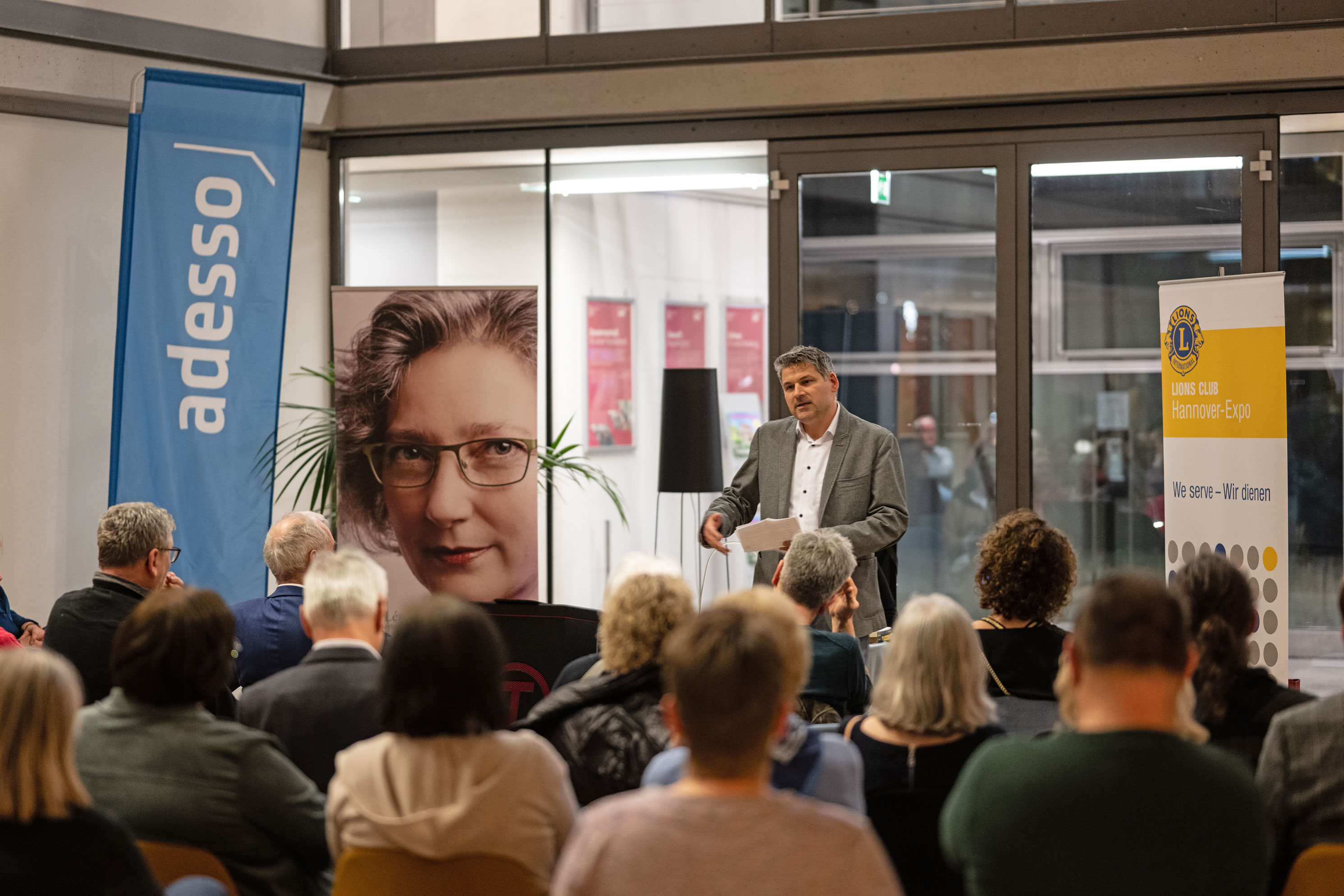 Jochen Stiepel, Kompetenzcenterleiter beim Gastgeber ADESSO SE an der Kugelfangtrifft in Hannover-Bemerode, hatte die Gäste zu Beginn der Lesung begrüßt und den erfolgreichen IT-Dienstleister vorgestellt. Zur Überraschung und zum Wohlbefinden der Gäste trugen auch die Besonderheiten des Gebäudes bei. Wer hatte schon mit einem Abendimbiss im Grün eines riesigen Wintergartens gerechnet!