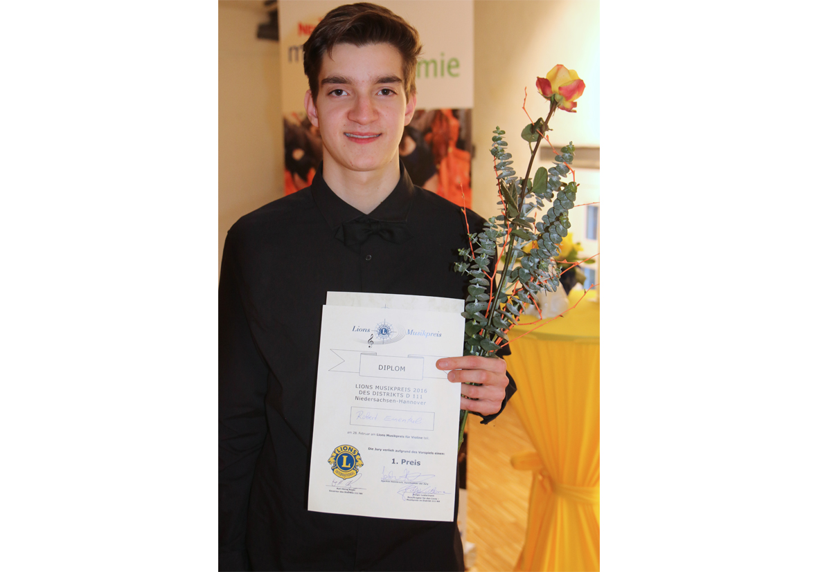Auch in diesem Jahr hatte der Lions-Distrikt nh 111, dessen Mitgliedsclubs die östliche Hälfte von Niedersachsen repräsentieren, einen Musikpreis für Violine ausgeschrieben, um den sich junge Menschen von 10 bis 23 Jahren bewerben konnten. Mit einem Pflichtstück aus dem 1. Satz des Violinkonzert Nr. 3 in G-Dur (KV 216) von Wolfgang Amadeus Mozart und selbst ausgewählten Wahlstücken war das Können zu beweisen. Fünf Teilnehmerinnen und Teilnehmer waren am Ende in die Auswahl gekommen, für die strenge Maßstäbe angelegt werden. Robert Einenkel hatte sich für sein Wahlprogramm das Stück Rhapsodie Nr. 1 (BB 94a) von Béla Bartók ausgesucht.